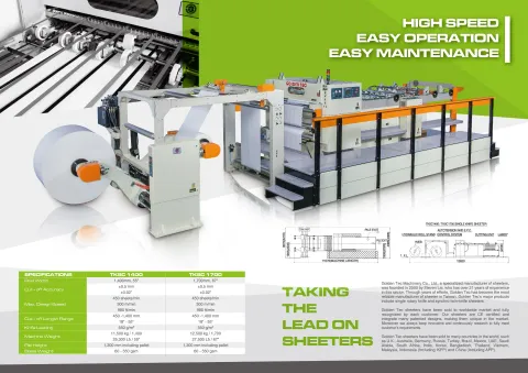 AC SERVO PRECISION HIGH SPEED SHEET CUTTER PAPER BOARD,FILMS,PLASTICS SHEETER QUICKLY SET, EASILY OPERATE, ACCURATELY CUT-OFF AND SMOOTHLY STACK. All meet the latest CE standard and own many patent right. ●SPECIFICATION: Web-Width: 1400 mm,1700 mm 55",67" Cut-off accuracy: ±0.5 mm ±0.02 in Max.design speed: 300 sheets/min 300 m/min 980 ft/min Cut-off length range: 450-1450 mm 18-57in Knife loading: 600 gms/m Machine weight: 11500 kgs/55", 12500 kgs/67" 25300 Lbs/55", 27500 Lbs/67" Pile height: 1300 mm included pallet Basis weight: 60-600 gsm